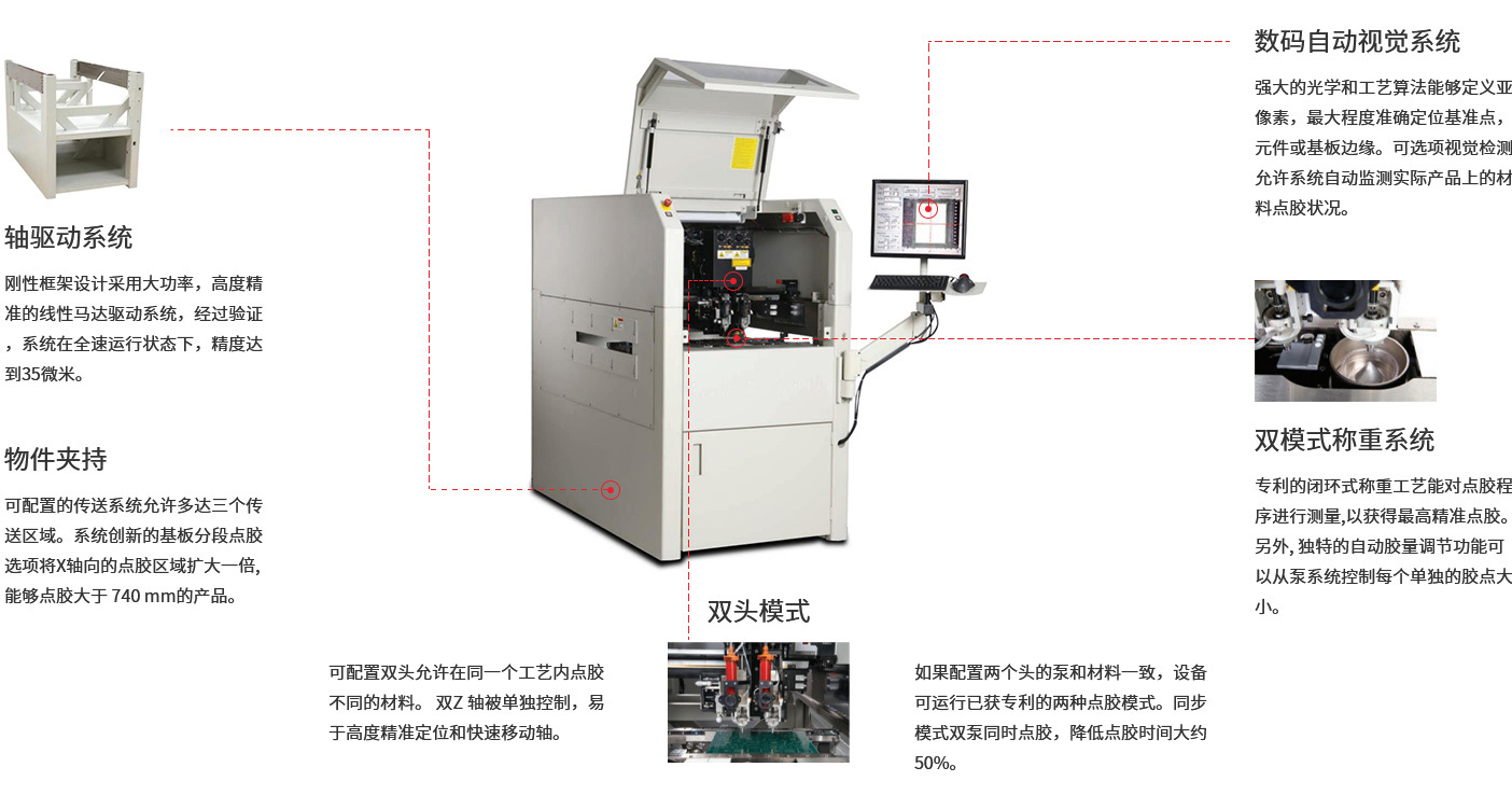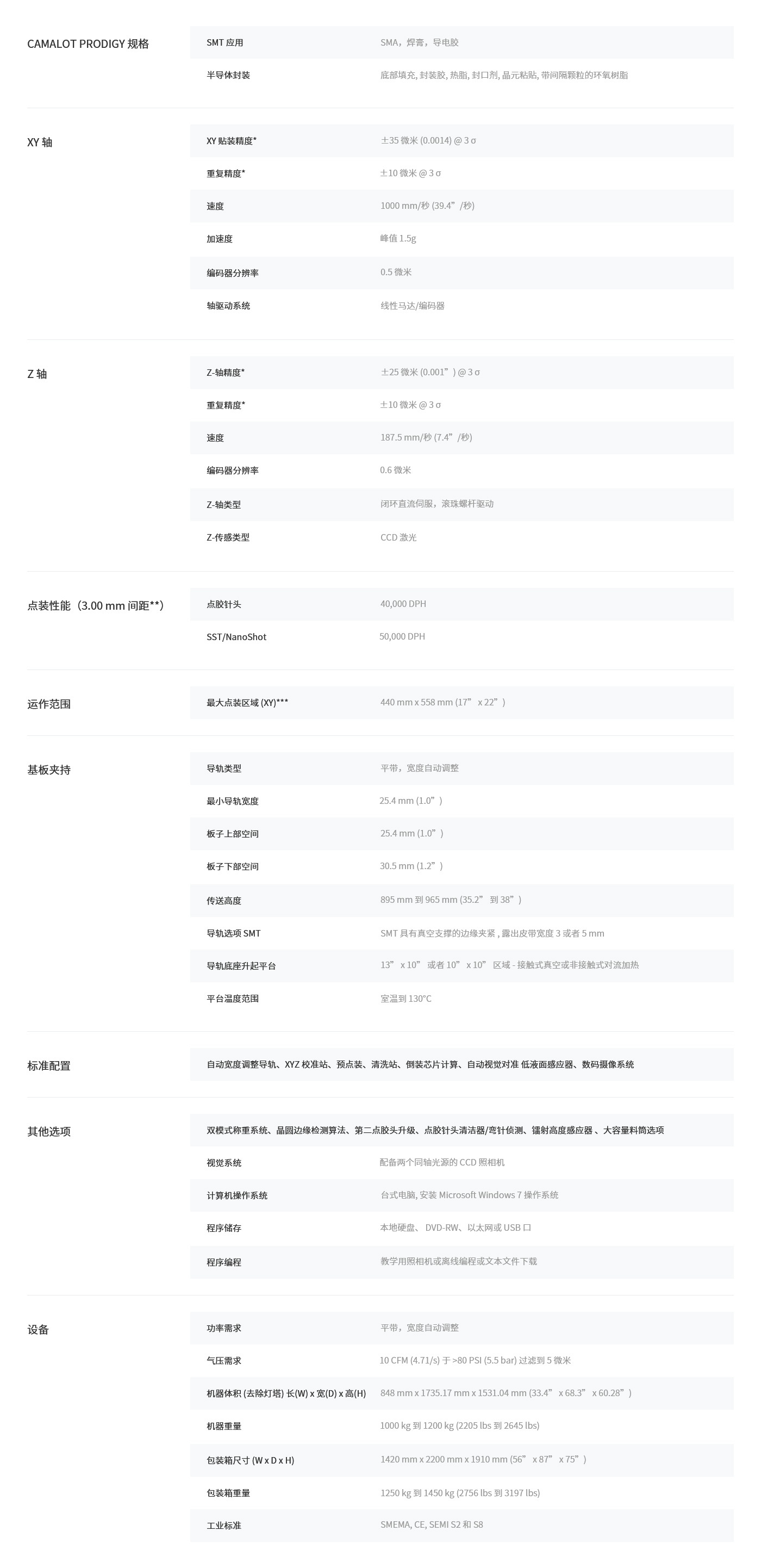 Prodigy 專為高速、高精度的點膠而設(shè)計和打造。Camalot 工程師們憑借超過 20 年在線性馬達和先進的運動控制系統(tǒng)方面取得的經(jīng)驗,使加速度峰值達到 1.5g。 最先進的 XY軸驅(qū)動系統(tǒng)是新一代點膠的關(guān)鍵點。創(chuàng)新的剛性框架設(shè)計融合了先進的線性驅(qū)動結(jié)構(gòu)使點到點的移動迅速,高精準(zhǔn)和長期的可重復(fù)性。